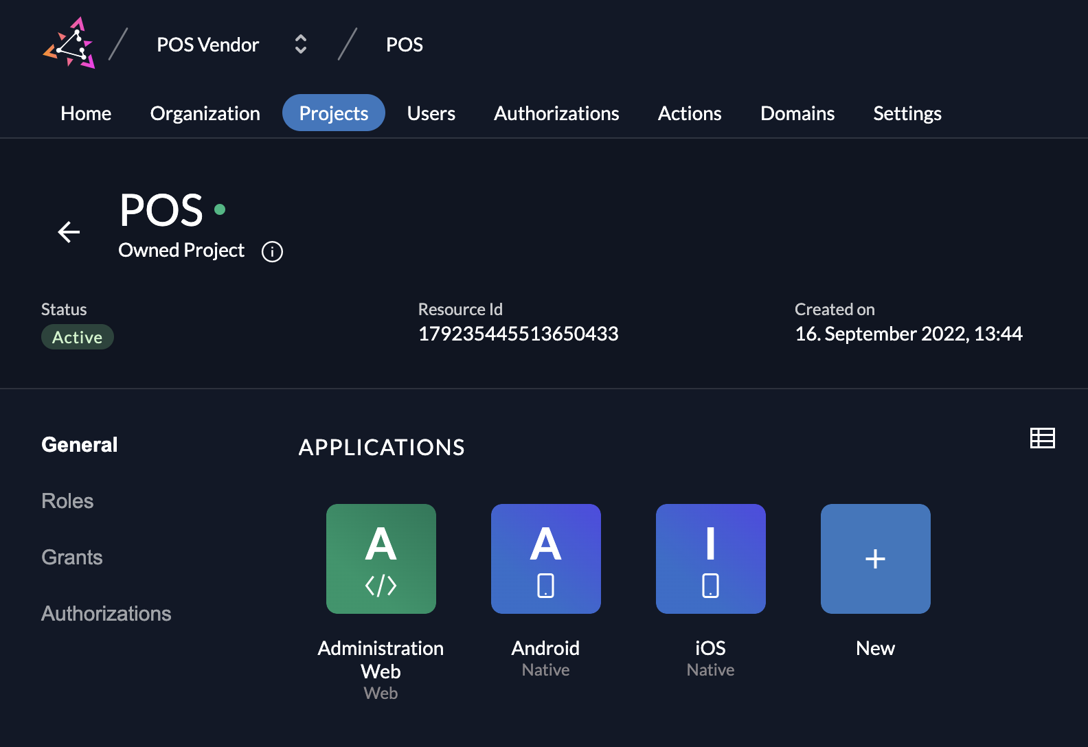 All applications within a project share the same Roles and Authorizations. This means you define a role once (e.g., admin) on the Project level, and it applies across all your web, mobile, and API applications.